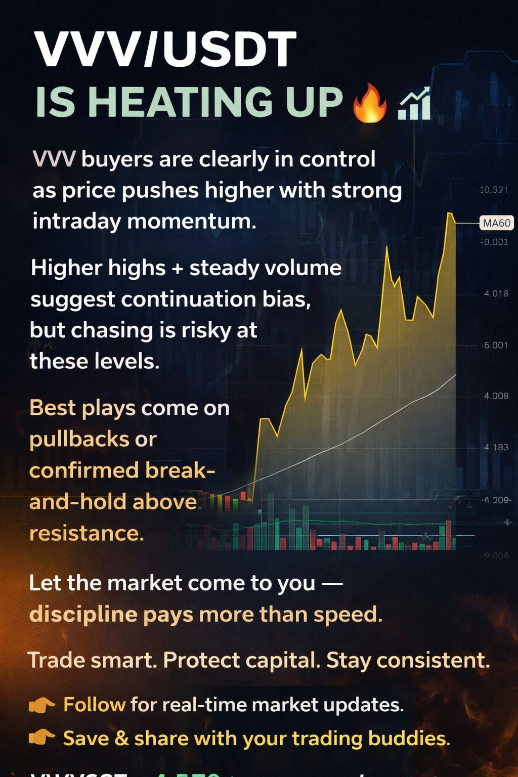 VVV buyers are clearly in control as price pushes higher with strong intraday momentum. Higher highs + steady volume suggest continuation bias, but chasing is risky at these levels. Best plays come on pullbacks or confirmed break-and-hold above resistance.