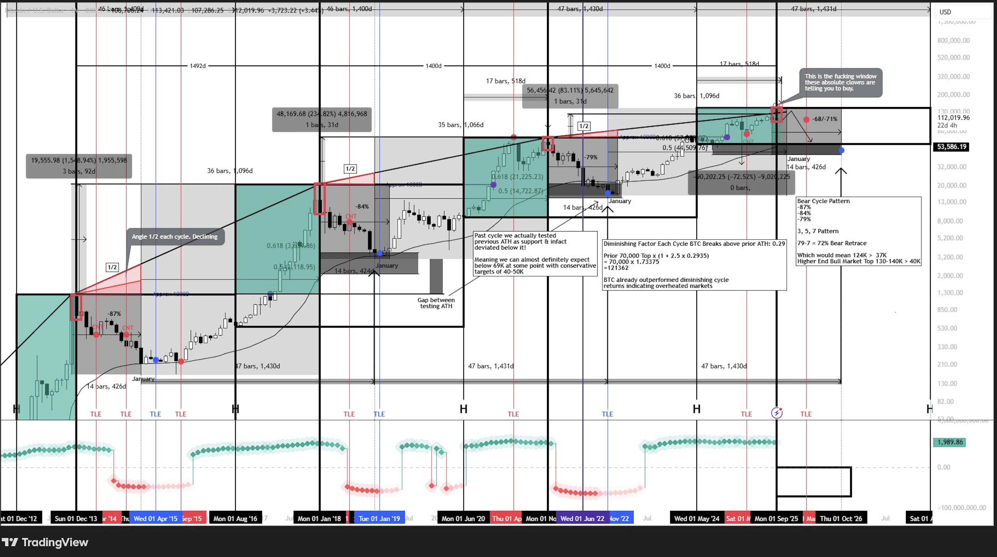 Si Bitcoin pousse d'une manière ou d'une autre dans la fourchette de 170 000 $ à 180 000 $, cela impliquerait un changement structurel, peut-être même une rupture avec le modèle de rendements décroissants qui a défini les cycles précédents. Mais ma stratégie est basée sur des données, pas sur l'espoir. Elle repose sur une confluence technique et macroéconomique, pas sur des récits spéculatifs. J'ai également eu raison à 90 % ce cycle sur le HTF et mon dossier parle de lui-même.