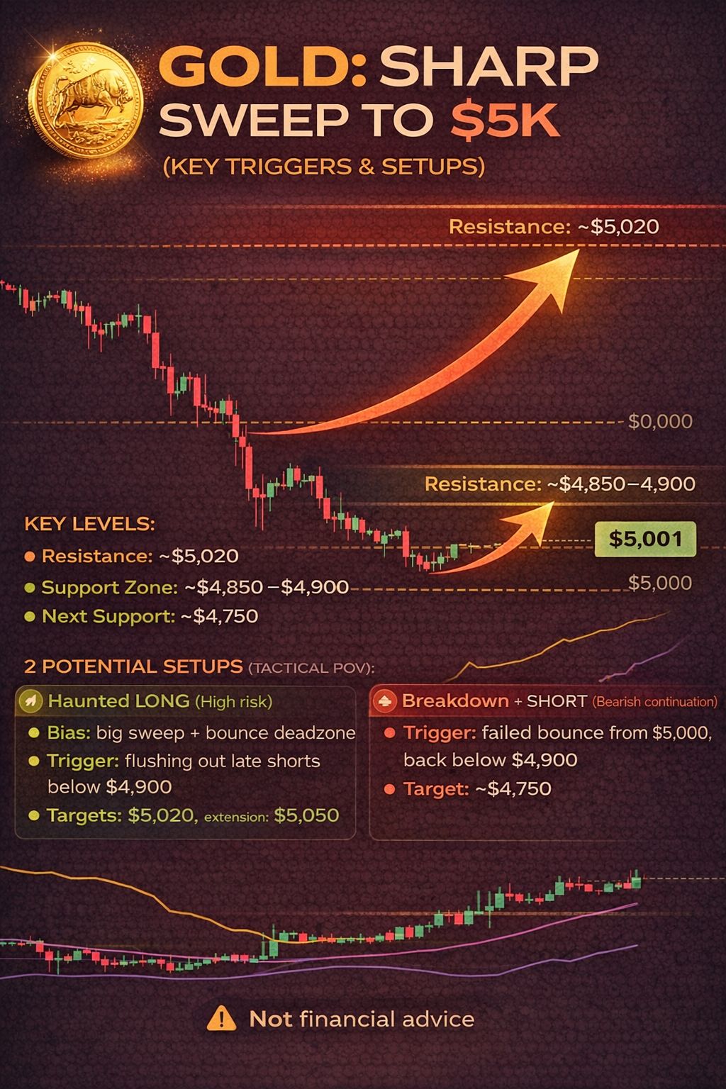 $XAU has staged an aggressive push toward the $5,000 psychological level, triggering heightened volatility and tactical positioning across derivatives and spot markets.