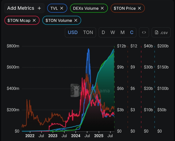 Les données de DeFiLlama offrent un instantané concret de la position de TON en termes d'utilisation réelle et de traction. Sa valeur totale verrouillée (TVL) tourne autour de plusieurs centaines de millions, dépassant historiquement les 600 millions de dollars et atteignant même 760 millions de dollars à un moment donné. Cela fait de TON l'une des dix meilleures blockchains en DeFi par TVL ; impressionnant pour un réseau relativement jeune.
