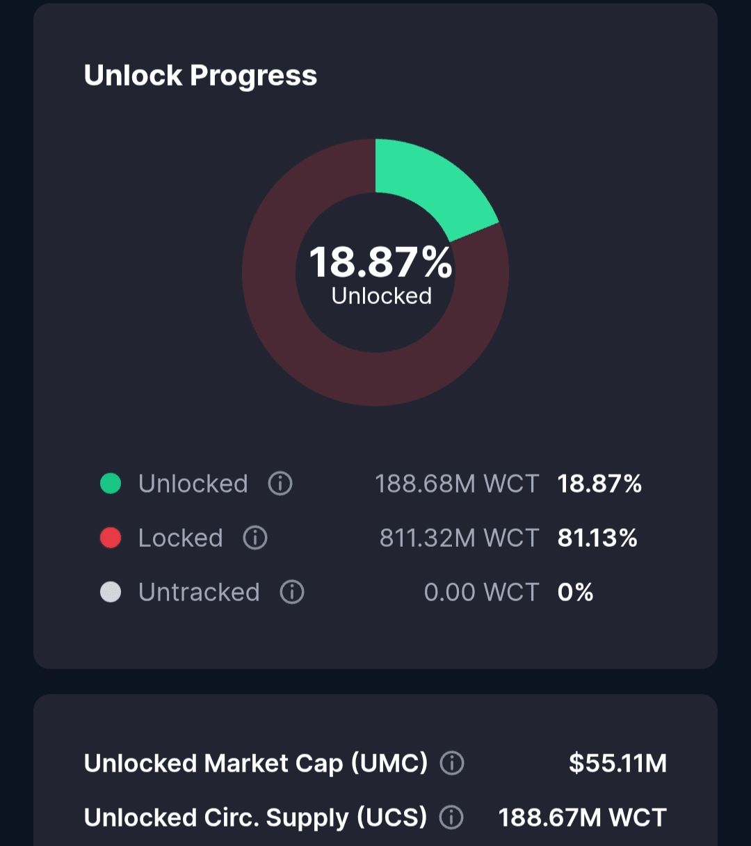 En ce moment, le marché ne traite que 18,87 % de l'offre totale de WCT (~188M tokens). Le reste ? Verrouillé. 81,13 % (~811M tokens) n'est pas encore entré en circulation. C'est un scénario classique à faible flottement et à haute FDV.