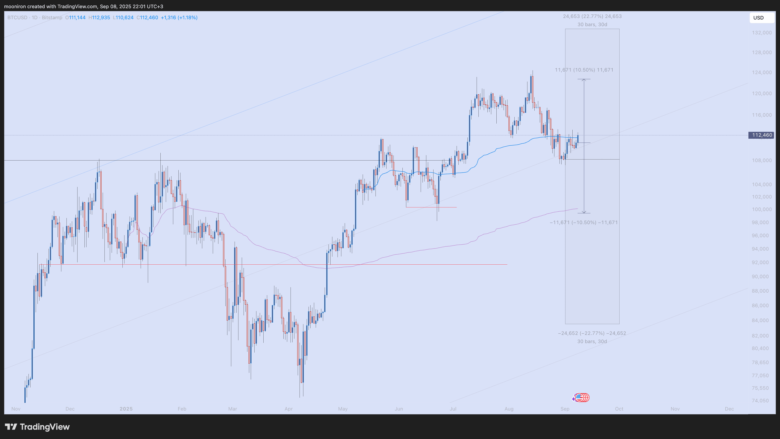 La plage de volatilité implicite de cette semaine se situe entre 99,5k et 123k. Je m'attends à ce que le prix franchisse d'abord la zone de 113k, puis teste la zone de 118-119k. Je pense que cette zone émerge comme un niveau clé à court terme. La probabilité d'une correction à partir de cette zone semble assez élevée. Par conséquent, je pense qu'il est nécessaire d'être prudent avec les transactions dans ces zones et que des transactions baissières pourraient être structurées.