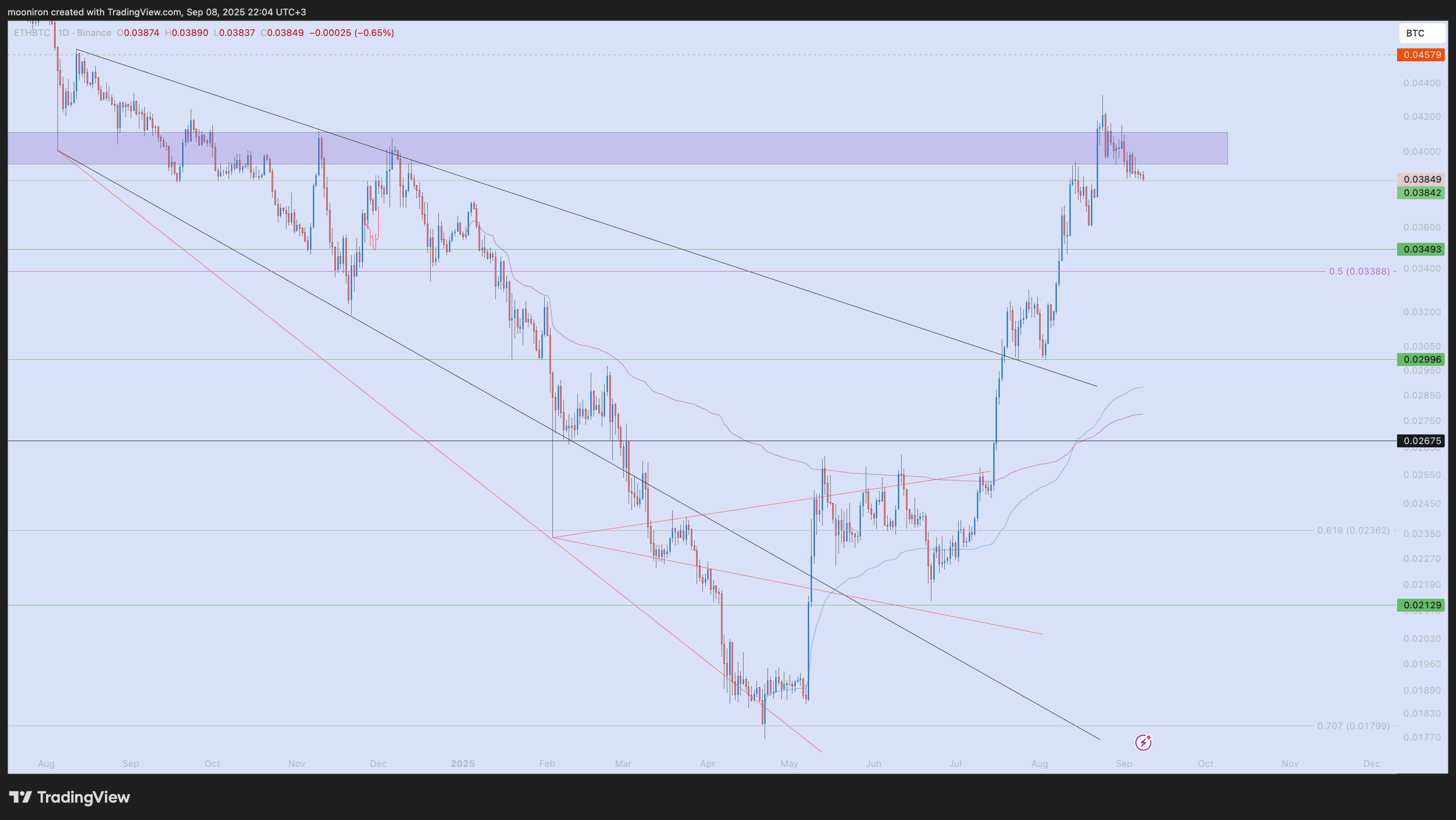 La semaine dernière, avec l'ETH perdant de l'élan par rapport au BTC, il y a eu un certain repli dans la paire. Pour que l'ETH retrouve de la force, il doit d'abord franchir résolument la résistance de 4 500 $ dans sa propre paire Dollar. Tant que cela ne se produit pas, la paire peut être attendue sous pression pendant un certain temps. Surtout après avoir connu une forte hausse, perdre le soutien important de la boîte violette ici rend un repli vers la zone de 0,033-0,034 semble possible. Prendre des positions courtes sur l'ETH et longues sur le BTC pourrait être plus logique.