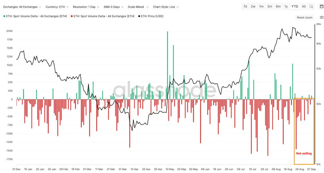 L'achat au comptant est en déclin : Le métrique delta du volume au comptant montre qu'il y a une différence nette négative entre les volumes d'achat et de vente sur les échanges, ce qui signifie que plus de personnes vendent de l'ETH sur le marché au comptant que n'en achètent. Cela indique un manque de dynamisme pour une reprise des prix.