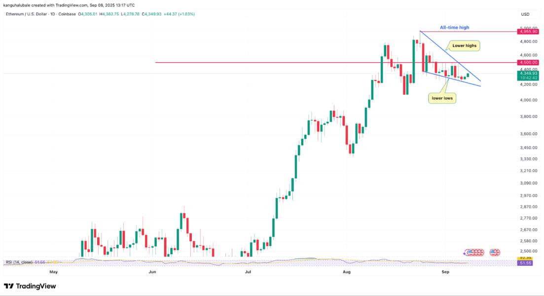 Modèle de triangle descendant baissier : Le prix de l'Ether a formé un modèle de triangle descendant sur son graphique journalier. C'est un modèle technique baissier caractérisé par une série de sommets de plus en plus bas et une ligne de support plate. Selon ce modèle, si le prix tombe en dessous du niveau de support de 4 200 $, cela pourrait déclencher une tendance baissière continue. L'objectif mesuré pour cette chute est d'environ 3 550 $, ce qui représente une baisse de 18 % par rapport aux niveaux de prix actuels.