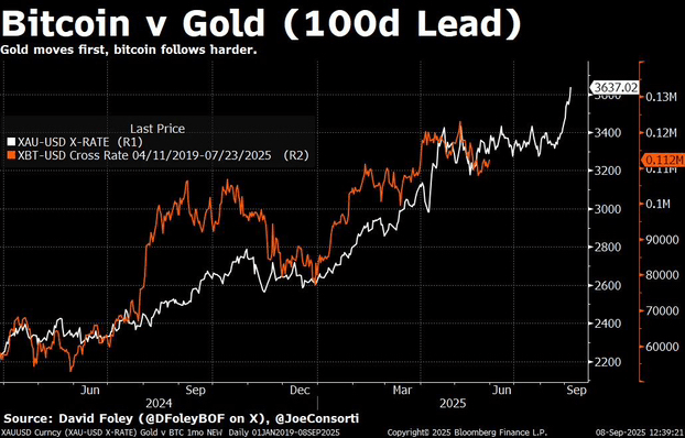 En septembre 2025, l'or a continué de gagner pour la quatrième semaine consécutive, atteignant un nouveau record à 3 659 $ l'once. Les investisseurs en Bitcoin ont regardé de près, attendant que cela suive $BTC alors que la relation entre les deux actifs a suscité de l'intérêt.