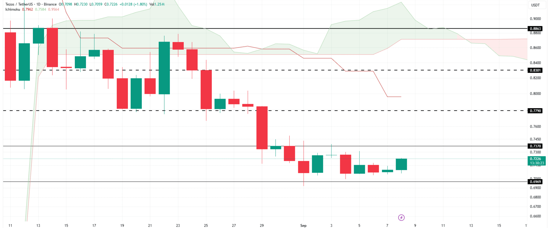 XTZ se négocie à 0,722 $, restant dans une fourchette étroite entre 0,737 $ et 0,696 $ depuis fin août.