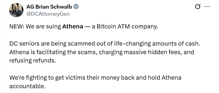 Une nouvelle bataille juridique dans la capitale des États-Unis met à nouveau en lumière les risques liés aux distributeurs automatiques de cryptomonnaies. Le procureur général de D.C., Brian Schwalb, a intenté une action en justice contre Athena Bitcoin, accusant l'opérateur de facturer des frais non divulgués et de ne pas protéger les utilisateurs contre la fraude.