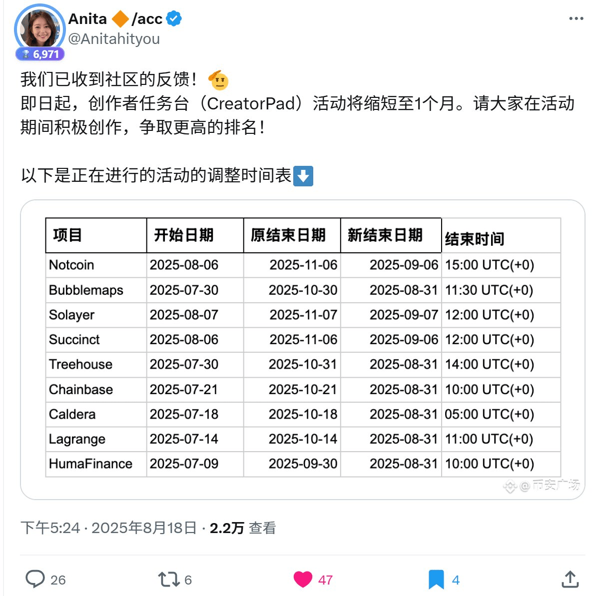Suite aux retours de la communauté, le professeur de massage de la place @Anitahityou a publié un message le 18.08 pour expliquer que l'activité CreatPad a été réduite à 1 mois, mais que le montant des récompenses reste inchangé.