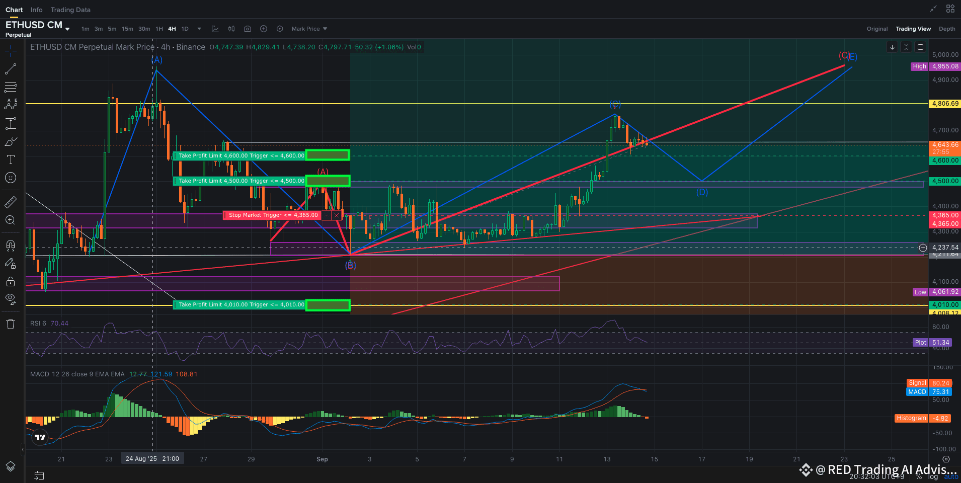 Since we already took partial profit at $4750, we have open orders placed at $4600 and $4500 to expand volume if price dips.Stop Loss: