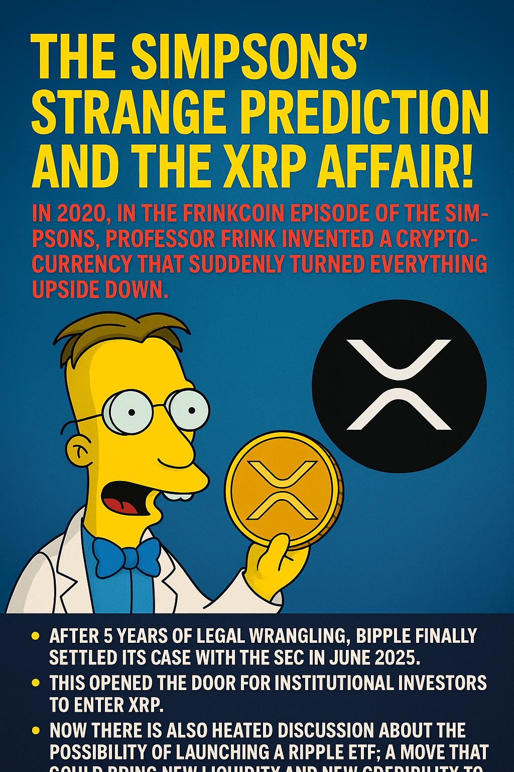 🔺De retour en 2020, pendant l'épisode des Simpsons Frinkcoin, le professeur Frink a introduit une cryptomonnaie qui a tout retourné. À l'époque, cela semblait n'être rien de plus qu'un gag de dessin animé — mais beaucoup croient maintenant que cela préfigurait le véritable parcours de XRP!