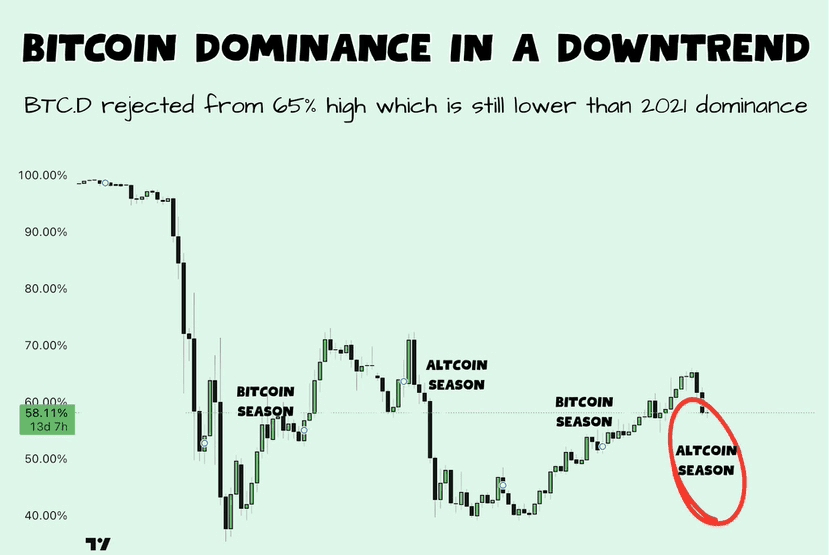 Nous sommes déjà au stade deux. La dominance BTC (BTC.D) est en train de chuter. Tout comme en 2017, 2021, et 2024, le prochain acte est la montée en flÚche des altcoins.