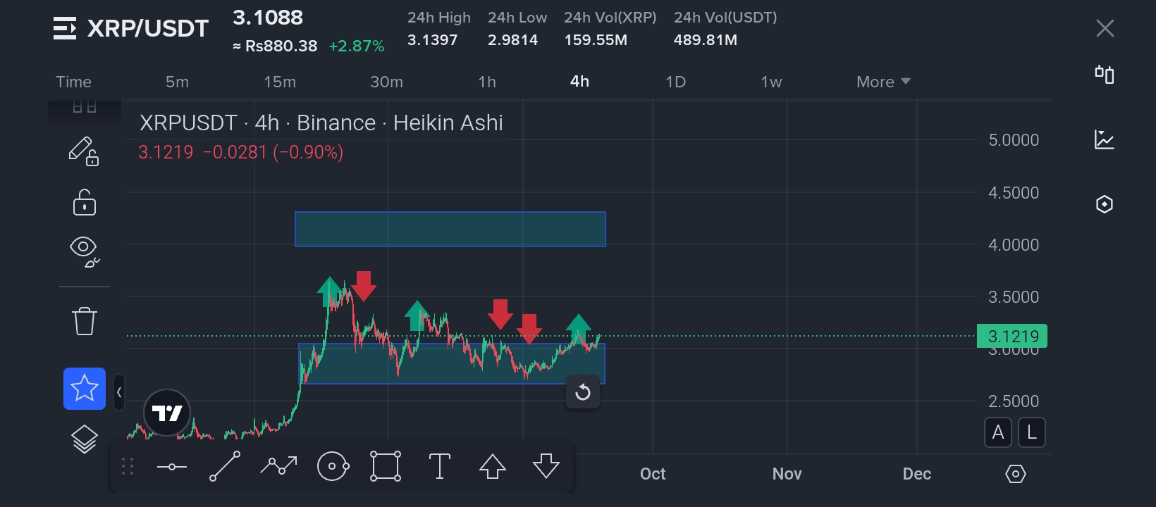 📊 Actuellement, XRP se négocie autour de 3,12 USDT, montrant un mouvement stable après une période de consolidation. Sur le graphique Heikin Ashi de 4H, nous pouvons clairement observer quelques configurations techniques intéressantes se formant que chaque trader devrait surveiller.