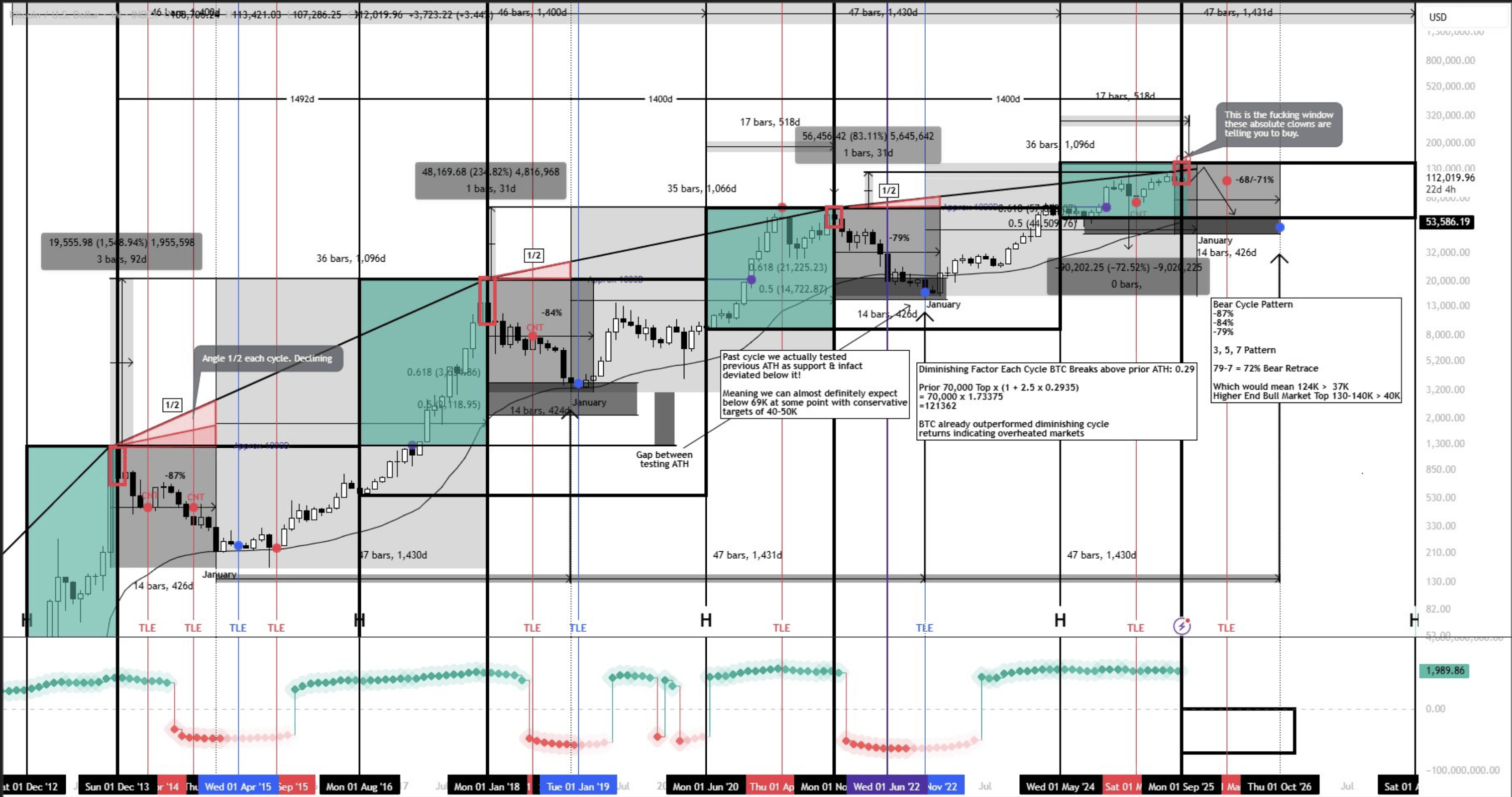 J'ai utilisé ce même système à 54K $, 76K $, et 90K $ pendant le marché haussier, et il a servi son but. Maintenant, compte tenu des conditions actuelles, je crois qu'une correction vers 60K $–70K $ au cours des 6–9 mois suivants est le résultat le plus probable.