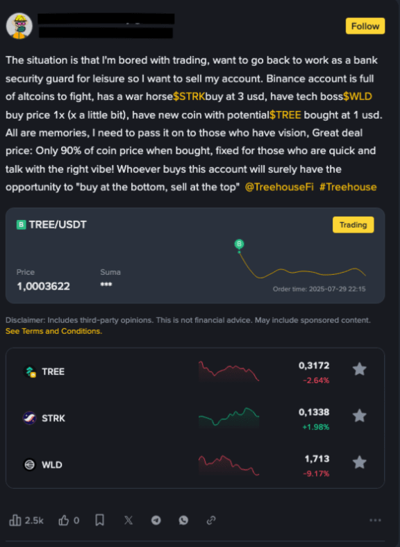 Récemment, un compte Binance d'occasion a été repéré en vente sur Binance Square. Le vendeur le présentait comme « prêt à l'emploi », affirmant qu'il contenait déjà un portefeuille de cryptomonnaies alternatives. Pour le rendre plus attrayant, il l'a mis en vente à 90 % de la valeur totale du portefeuille – présentant ainsi l'achat comme une affaire à 10 % en dessous des prix actuels des pièces.