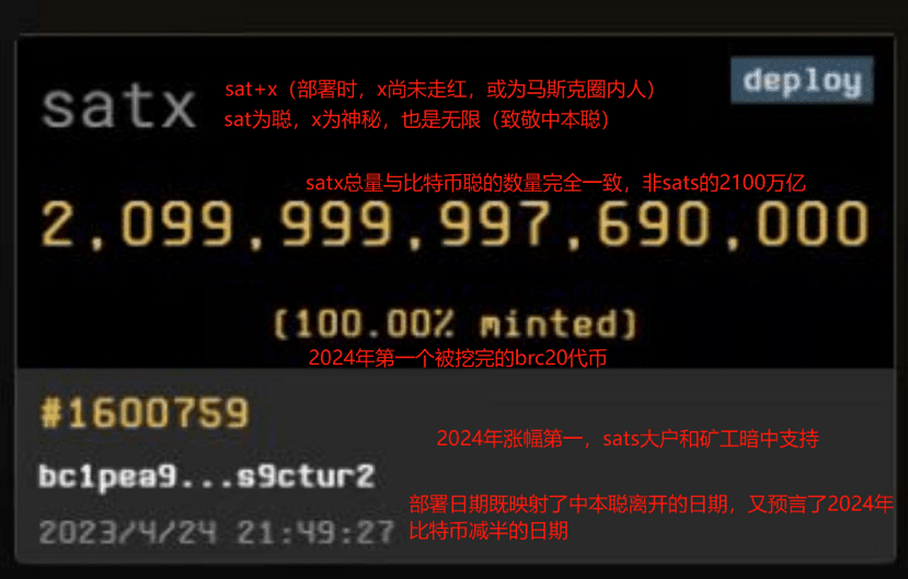 2. La signification fortuite de l'heure de déploiement :#satxa été déployé dans le bloc BTC le 24 avril 2023. Ce moment s'est avéré être le départ du pionnier du Bitcoin, Satoshi Nakamoto, du forum Bitcoin (Satoshi Nakamoto a posté sur le forum Bitcoin sur 23 avril 2011 Le dernier message a disparu. Dès lors, Bitcoin est devenu une chose sans propriétaire et est devenu un représentant de la décentralisation) 12 ans plus tard. De plus, la quatrième réduction de moitié du Bitcoin aura également lieu vers le 24 avril 2024. C’est soit une coïncidence, soit la volonté de Dieu. Un bon nom est étroitement lié aux événements majeurs de Bitcoin. Cela deviendra également l'un des grands récits de Satx.