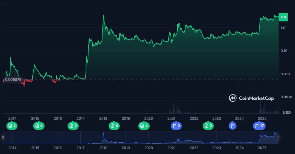 Finalement, en août 2025, l'affaire a été classée et Ripple a accepté de payer une amende de 125 millions de dollars. Le jugement a confirmé que le XRP n'est pas un titre dans les transactions secondaires, même si les ventes institutionnelles resteront soumises à la surveillance réglementaire. Ce résultat a apporté plus de clarté et de confiance, propulsant le cours du XRP au-dessus de 3 dollars en septembre 2025.