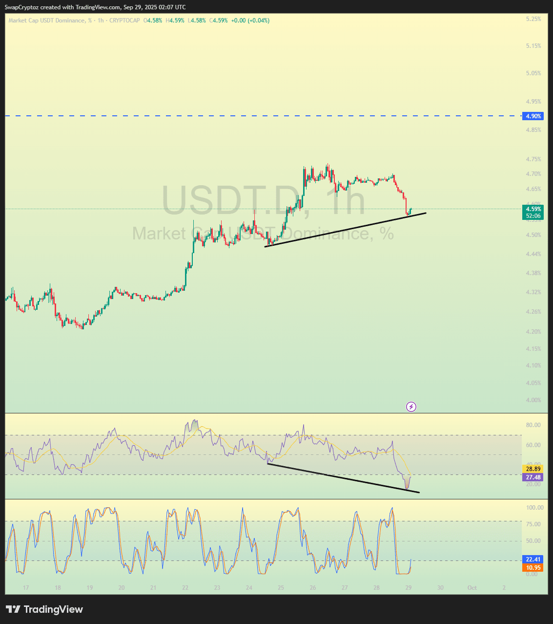 Et vous pouvez me dire pourquoi je suis sûr que BTC va chuter ? La raison, vous pouvez voir le graphique BTC, BTC montrait une divergence baissière et de l'autre côté USDT.D montrant une divergence haussière donc je suis sûr que BTC va bientôt chuter.