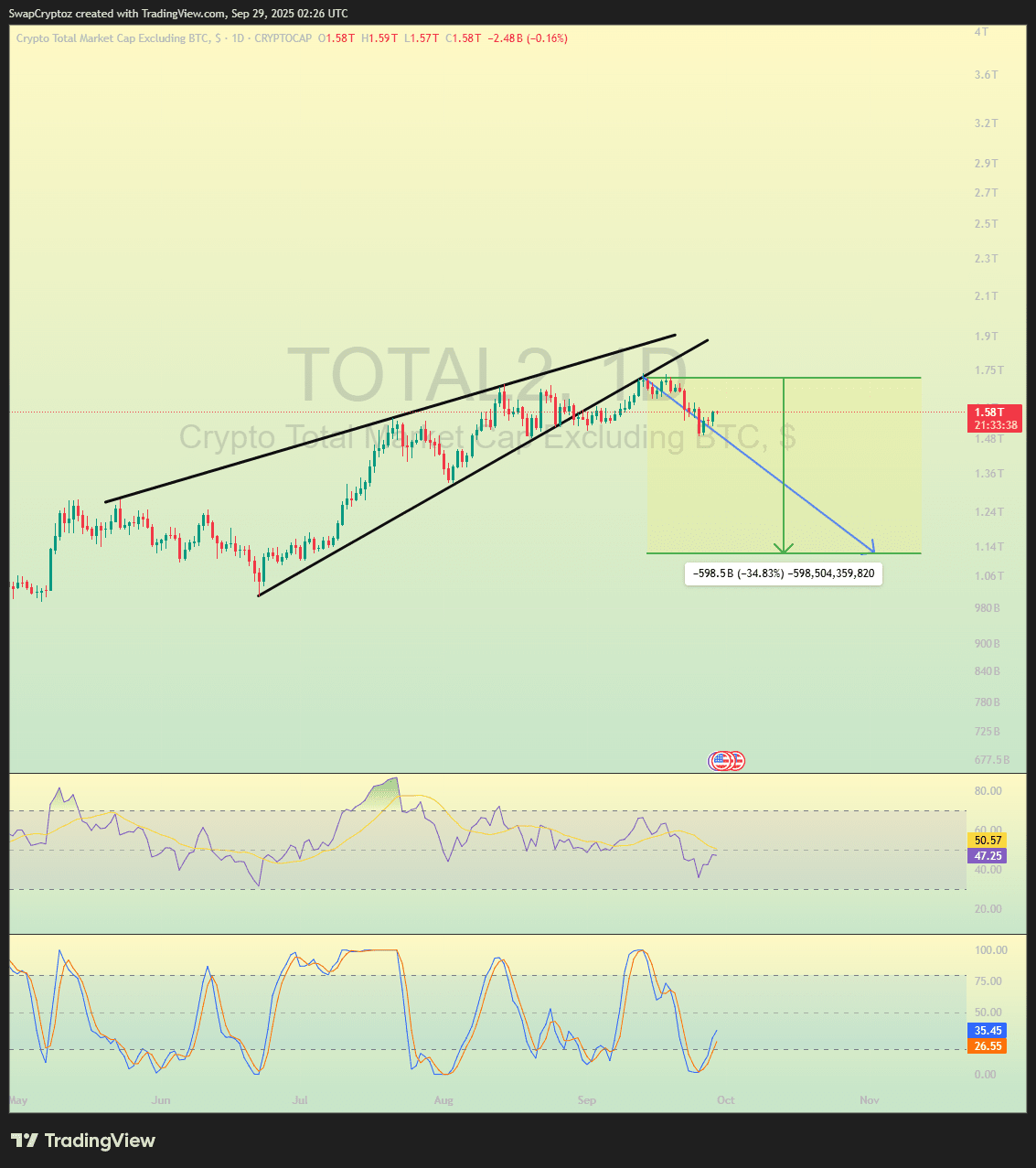 Il y a un graphique TOTAL2 qui montre que la capitalisation du marché des cryptomonnaies a cassé à partir d'un modèle de coin montant. Cela signale une possible grande chute, d'environ 35%. Puisque l'Ethereum est la plus grande partie de TOTAL2, si TOTAL2 tombe, ETH tombera probablement aussi.