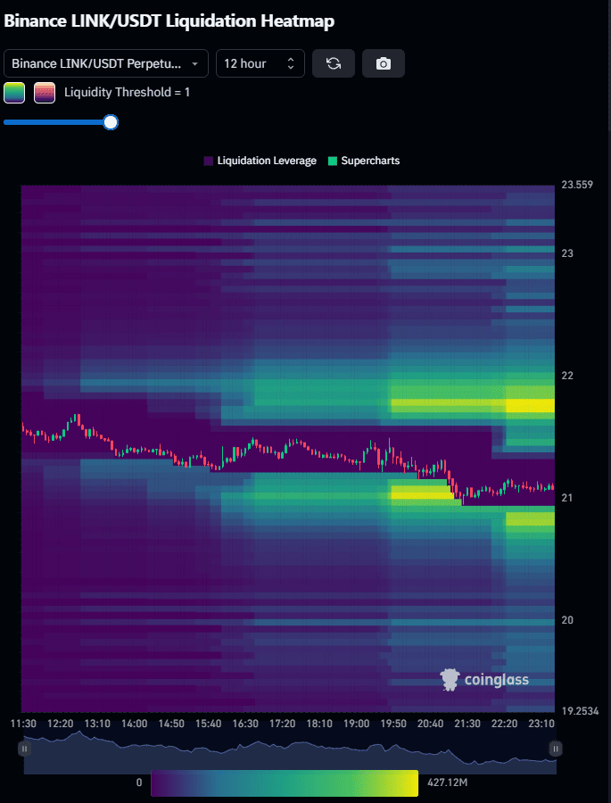 Nous pouvons voir que la carte thermique montre une grande liquidité au-dessus du prix actuel, ce qui pourrait faire monter LINK vers 22 $ en premier. Après avoir rempli cette zone, le prix pourrait faire face à de fortes ventes et commencer à chuter.