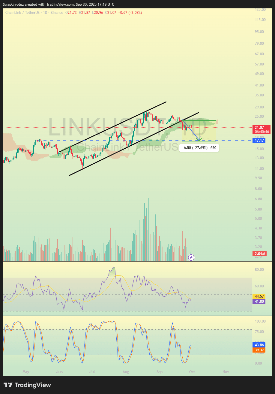 Chainlink a rompu son canal haussier et se déplace maintenant vers le bas. Si la pression à la vente continue, le prix pourrait tomber vers le support de 17 $. Les indicateurs de momentum montrent également une faiblesse, signalant un risque de baisse supplémentaire.