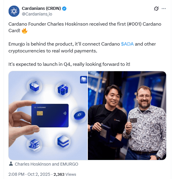 ¡Nous avons l'arrivée imminente de la Carte Cardano! Le fondateur Charles Hoskinson a reçu la première Carte Cardano (#001) 🤯, et son lancement officiel, prévu pour le quatrième trimestre de 2025, est le développement le plus important pour l'utilité réelle de ADA. Ce n'est pas du battage, c'est une infrastructure.
