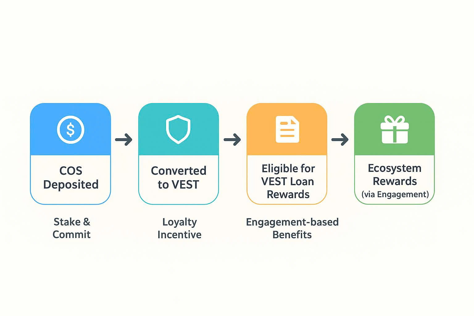 ✅ Exemple : Un utilisateur dépose 50 000 COS, convertit 30 000 COS en VEST, et a retiré 5 000 COS au cours des 60 derniers jours. Leur récompense = 30 000 – 5 000 = 25 000 VEST Loan.