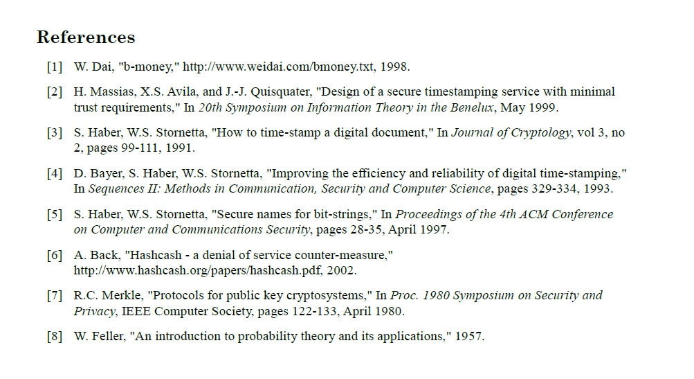 À la fin du document blanc du Bitcoin, publié en 2008, nous pouvons trouver au moins deux autres cypherpunks comme références : Adam Back et Wei Dai. Le premier a proposé le système Hashcash en 1997 (qui a inspiré le système de minage cryptographique), tandis que le second a exposé sa propre vision d'une monnaie numérique potentiellement décentralisée en 1998. Ces tentatives préliminaires nécessitaient certaines corrections, et Satoshi a fait de son mieux pour tout assembler.