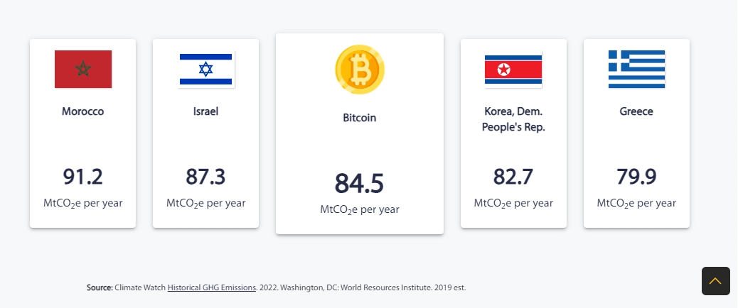 Émissions de gaz à effet de serre du Bitcoin comparées à celles des pays (CBECI)