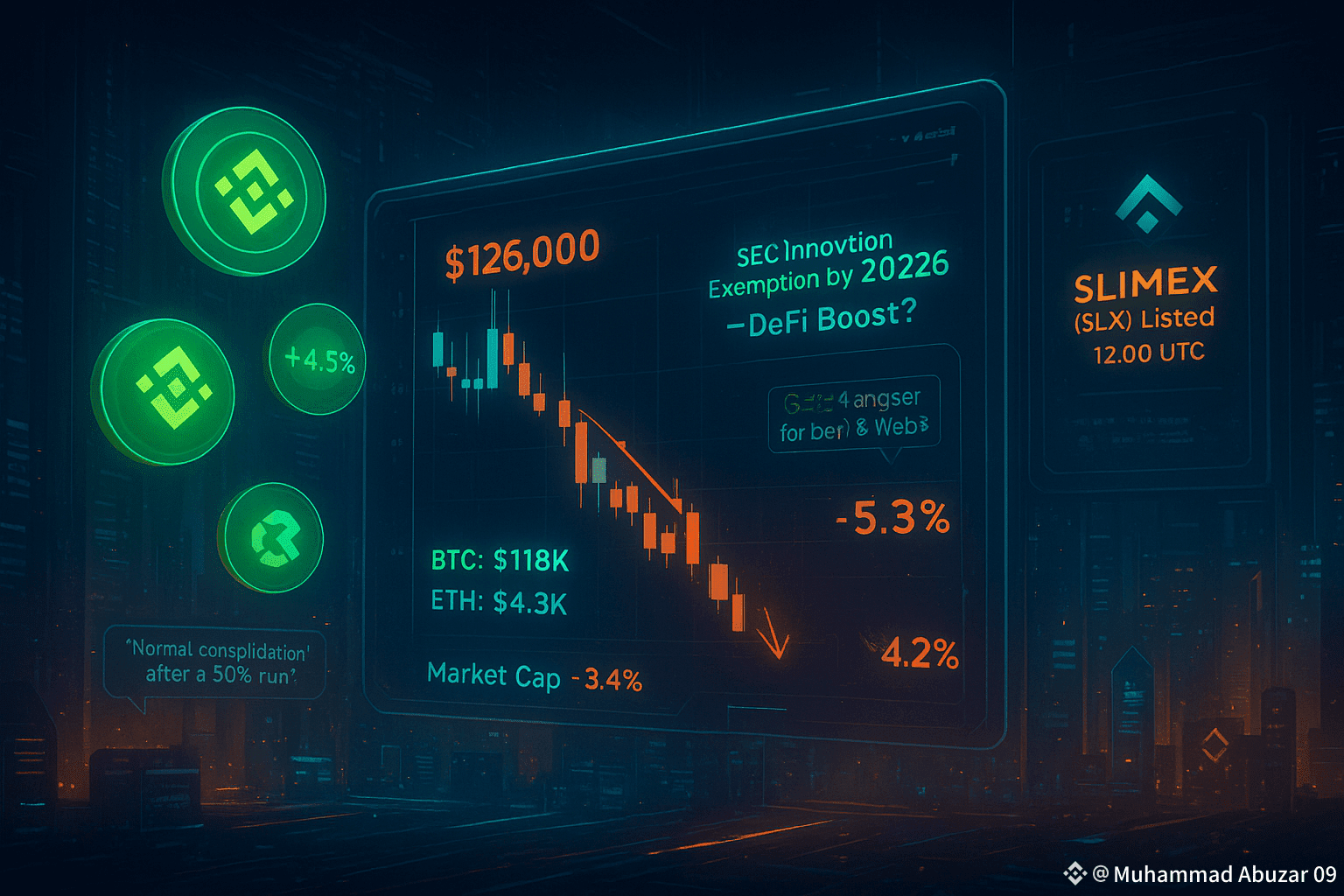 The cryptocurrency market took a breather today, with Bitcoin (BTC) sliding 2.8% to around $121,100, down from its recent peak of $126,000. Ethereum (ETH) followed suit, dropping 5.3% to $4,480, as profit-taking swept through the market after a weeks-long rally. The total crypto market cap contracted by 3.4%, reflecting a broader pullback in sentiment.Despite the dip, some altcoins bucked the trend. Binance Coin (BNB) surged 4.5% to $1,280, driven by optimism around Binance’s ecosystem expansion. Smaller tokens like ZRX (+3.2%) and NEAR (+2.1%) also posted gains, while meme coin FLOKI shed 2.7%. The volatility underscores a market grappling with overheated conditions and looming catalysts.A key development today was SEC Chairman Paul Atkins’ announcement of a proposed "innovation exemption" for crypto projects, expected to take shape by early 2026. Shared amid a U.S. government shutdown, the plan aims to streamline regulations for blockchain startups, potentially unlocking new capital inflows. “This could be a game-changer for DeFi and Web3,” said a crypto analyst on X.Institutional interest remains robust. GraniteShares filed for 3x leveraged ETFs targeting Bitcoin, Ethereum, Solana, and XRP, signaling Wall Street’s growing appetite for crypto exposure. Meanwhile, Binance’s Alpha platform listed SLIMEX (SLX), a health-tech token, with tradI'm ing kicking off at 12:00 UTC today.
