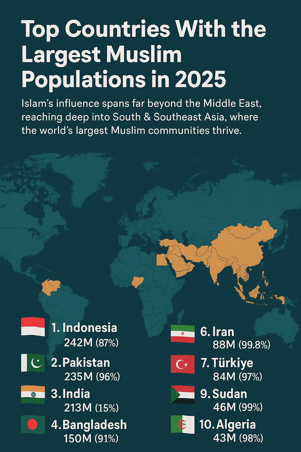 L'influence de l'Islam s'étend bien au-delà du Moyen-Orient, atteignant profondément l'Asie du Sud et du Sud-Est, où les plus grandes communautés musulmanes du monde prospèrent. 🌏