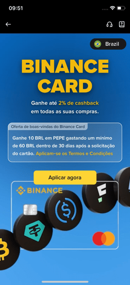 Dans l'application Binance, allez dans Menu > Binance Pay > Carte Binance. Vous verrez un écran de présentation avec les avantages de la carte, y compris le cashback et l'offre de bienvenue.