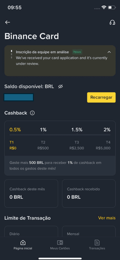 Vous pouvez vérifier l'état de votre demande dans l'onglet de la carte Binance dans l'application. Là, apparaîtra le message : "Inscription de l'équipe en cours d'analyse", indiquant que le processus est encore en cours.