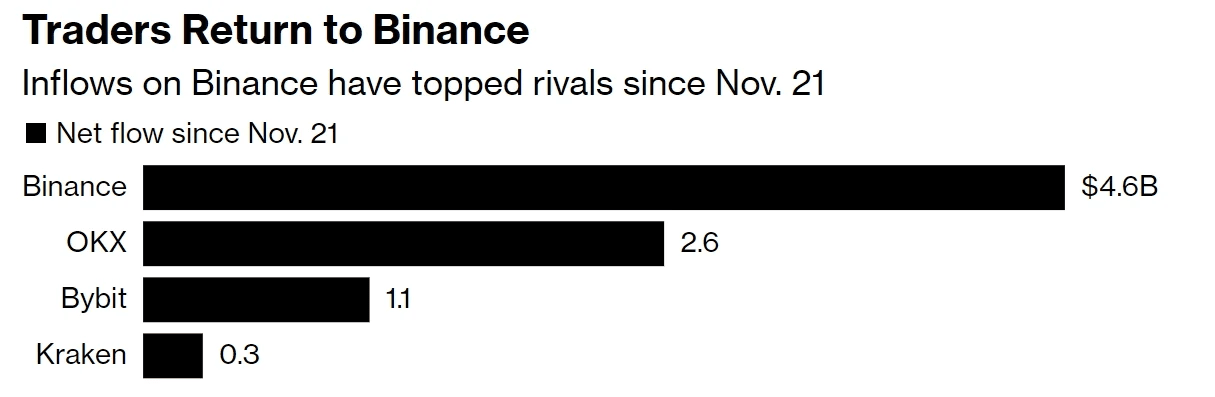 Selon les données de Defillama, au cours des deux mois qui ont suivi, les entrées nettes de Binance ont atteint 4,6 milliards de dollars, devançant toujours les autres concurrents boursiers, notamment les 2,6 milliards de dollars d'OKX et les 1,1 milliards de dollars de Bybit.