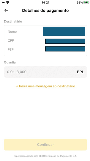 Après avoir saisi la clé Pix, l'application affichera les données du destinataire, telles que le nom, la banque et le CPF/CNPJ. Ici, vous définissez également le montant qui sera envoyé, toujours en reais.