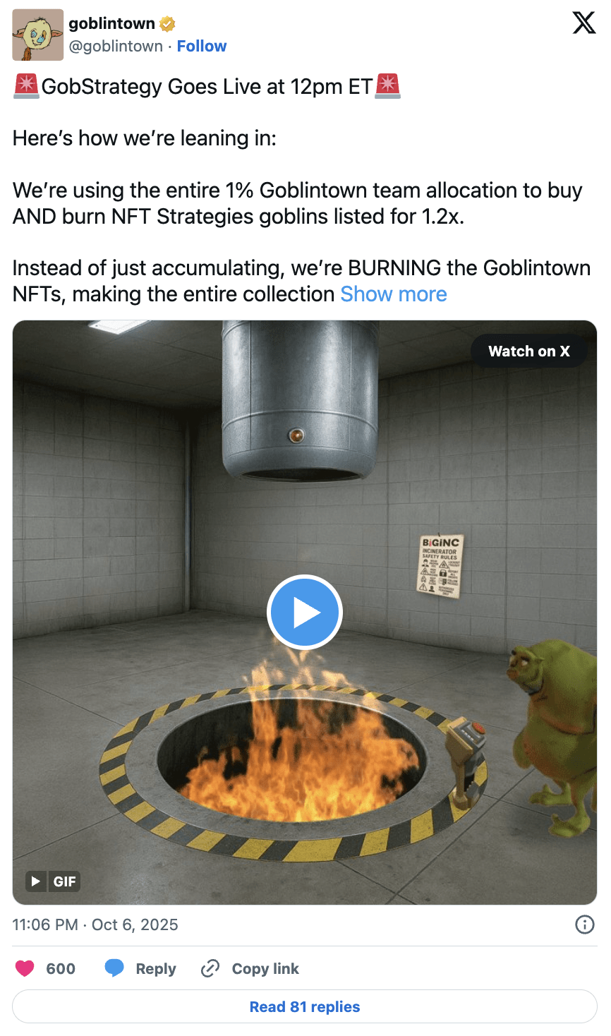 Le studio Truth Labs est connu pour avoir créé la série NFT satirique (Goblintown), et a maintenant lancé GobStrategy, un nouveau projet sur la chaîne axé sur les mécanismes déflationnistes, où l'équipe utilisera 1 % des fonds alloués à l'équipe Goblintown pour acheter et brûler des jetons mis en vente à 1,2 fois le prix de base, ainsi que les jetons GOB correspondants liés à chaque œuvre.