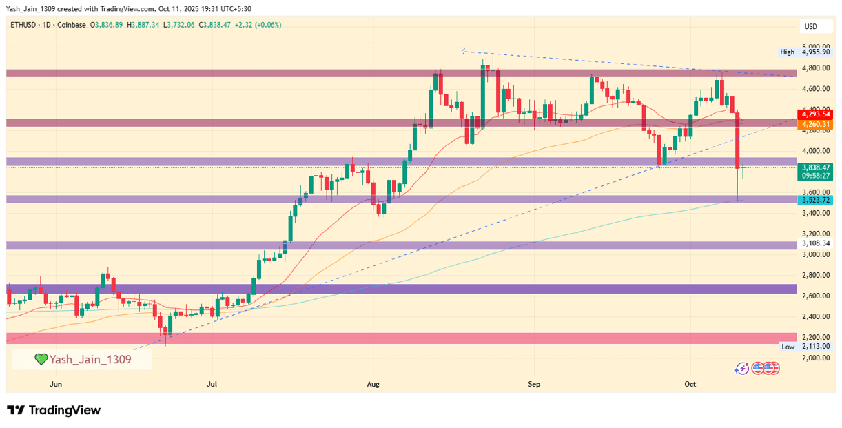 La monnaie Ethereum $ETH a connu une forte baisse, avec une montée de la panique sur les marchés mondiaux. Le couple ETH/USD est tombé de niveaux proches de 4300 dollars à un creux de 3510 dollars, avant de se redresser partiellement vers 3830 dollars.