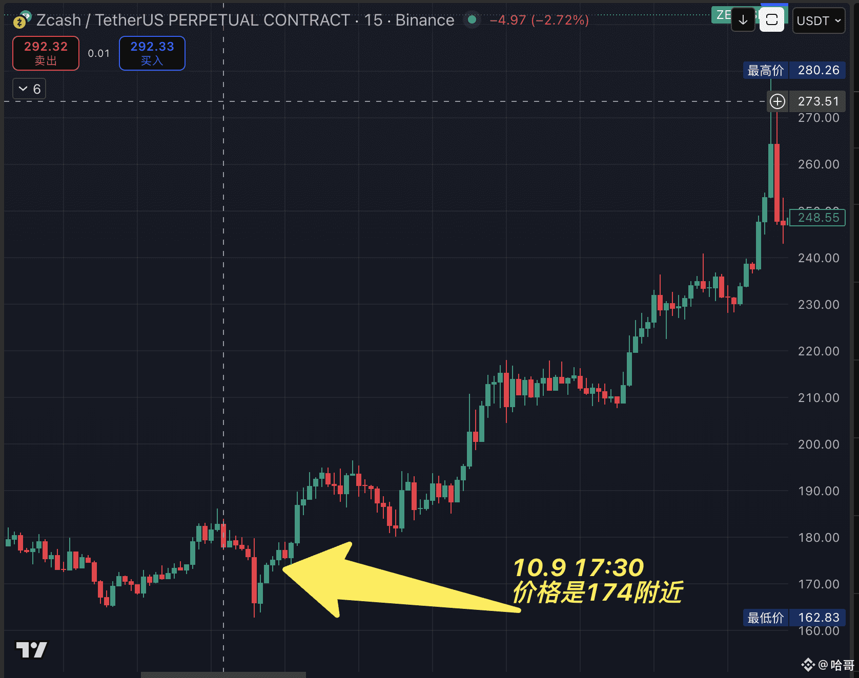 ZEC:10.9下午5点半发出雷达,庄家吸筹,当时价格是174,当前最高价格到达将近298。涨幅71%