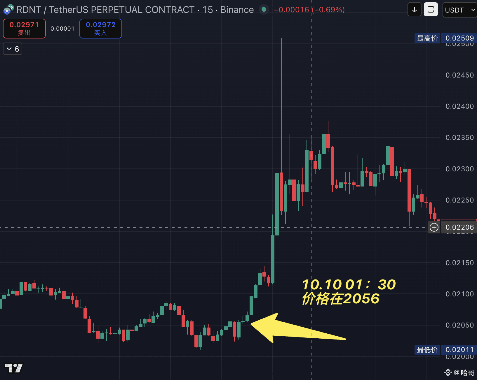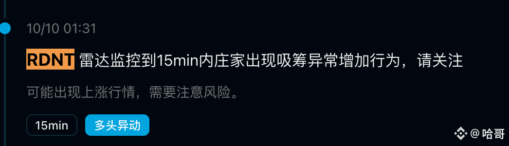 RNDT:10.10 01:30,发出雷达,庄家吸筹,当时价格是0.02056,当前最高价格0.044。涨幅114%