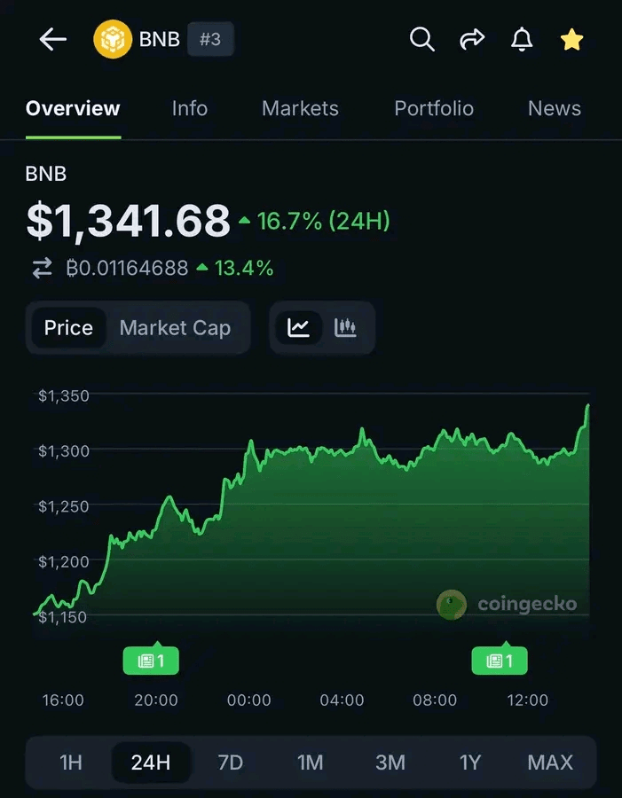 $BNB vient de faire un mouvement explosif, grimpant Ă 1 341,68 $ â marquant un gain de 16,7 % au cours des derniĂšres 24 heures ! đ