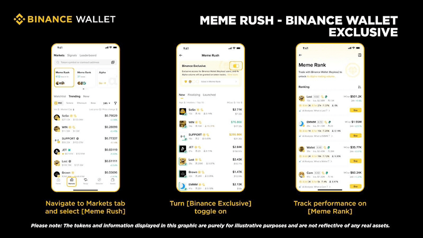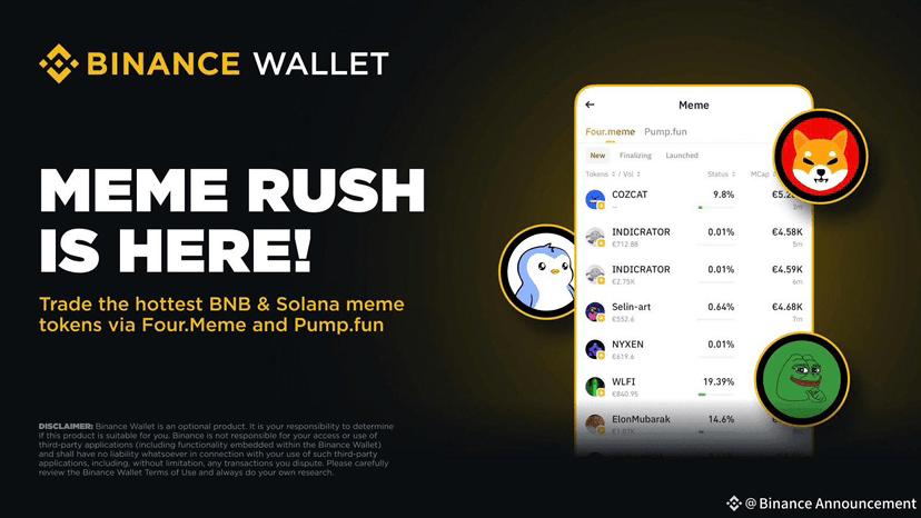Meme Rush – Exclusivité du portefeuille Binance est un nouveau programme du portefeuille Binance (sans clé), permettant aux utilisateurs de posséder tôt des tokens meme potentiels — avant qu'ils ne soient listés publiquement.