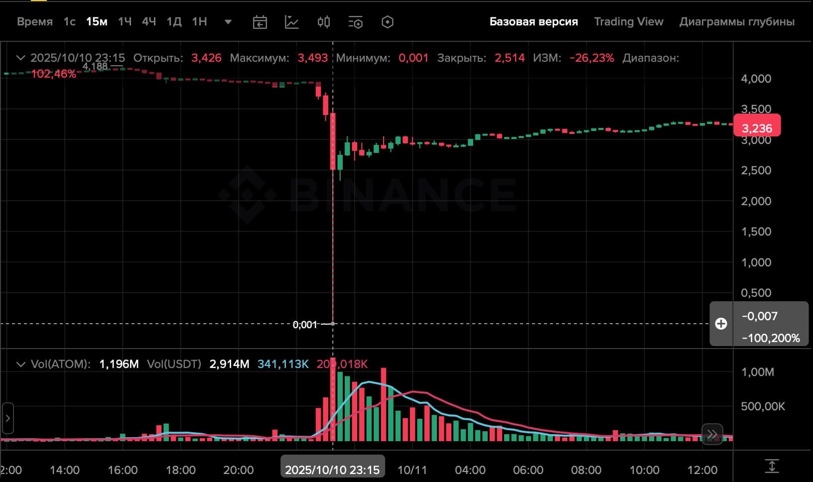J'ai pris comme base deux plateformes - Binance et Bybit. Sur le graphique avec une période de 15 minutes, on voit effectivement : le 10 octobre 2025 à 21:15, un intervalle de $0.001 à $3.493 a été enregistré sur Binance,