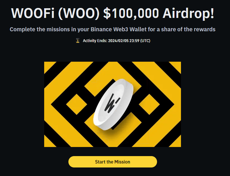 Salut les passionnés de crypto ! Binance fait monter la pression dans le monde de la cryptographie avec un Airdrop Web3 Wallet exclusif, offrant la somme énorme de 100 000 $ en jetons WOOFi (WOO). Du 23 janvier au 5 février 2024, préparez-vous pour un voyage passionnant de missions en utilisant le portefeuille Web3 de Binance pour remporter votre part des récompenses.