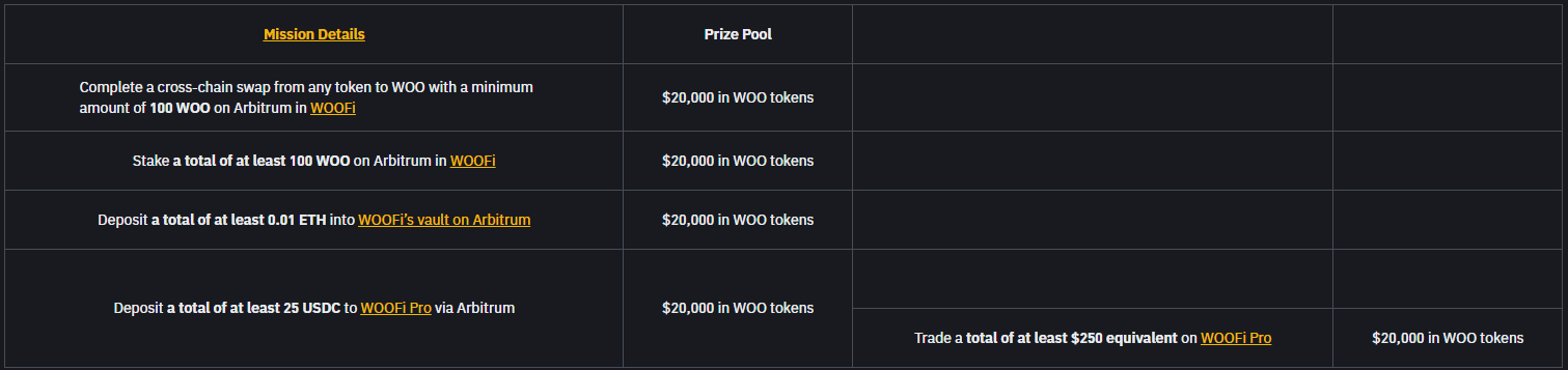 Misez un total de 100 WOO sur Arbitrum dans WOOFi - Gagnez 20 000 $ en jetons WOO