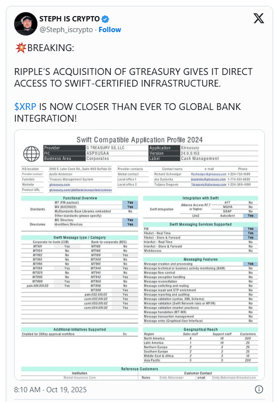 Selon Steph, l'acquisition de GTreasury par Ripple lui confère effectivement le contrôle direct d'une infrastructure de gestion de trésorerie certifiée par SWIFT ✅, un mouvement qui place Ripple au cœur de la connectivité bancaire d'entreprise mondiale.