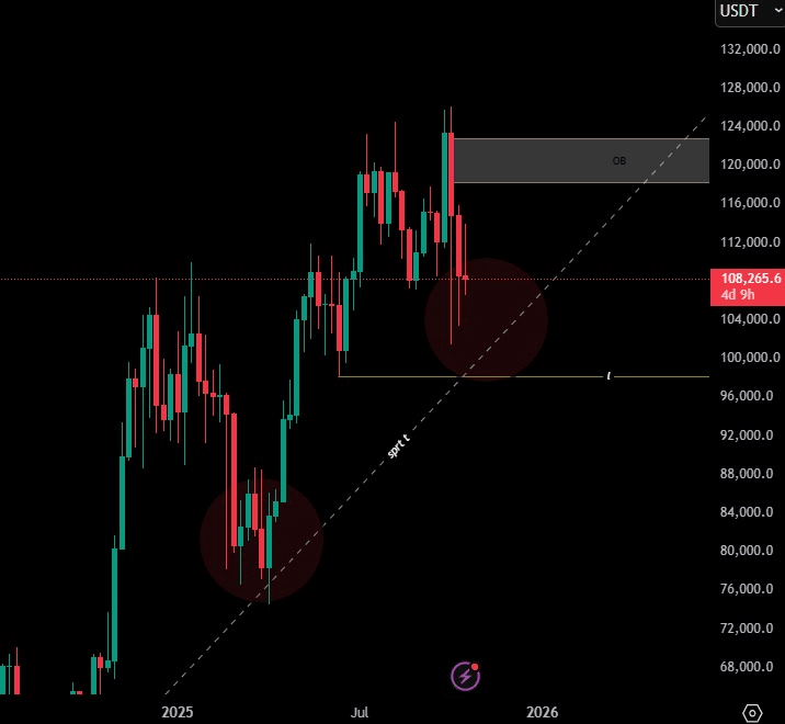 Si BTC donne une forte clĂŽture hebdomadaire ou quotidienne en dessous de 102K $, alors il pourrait descendre vers 95K $ ou mĂȘme 85K $â88K $, car il y a un FVG et une forte liquiditĂ© dans cette zone.