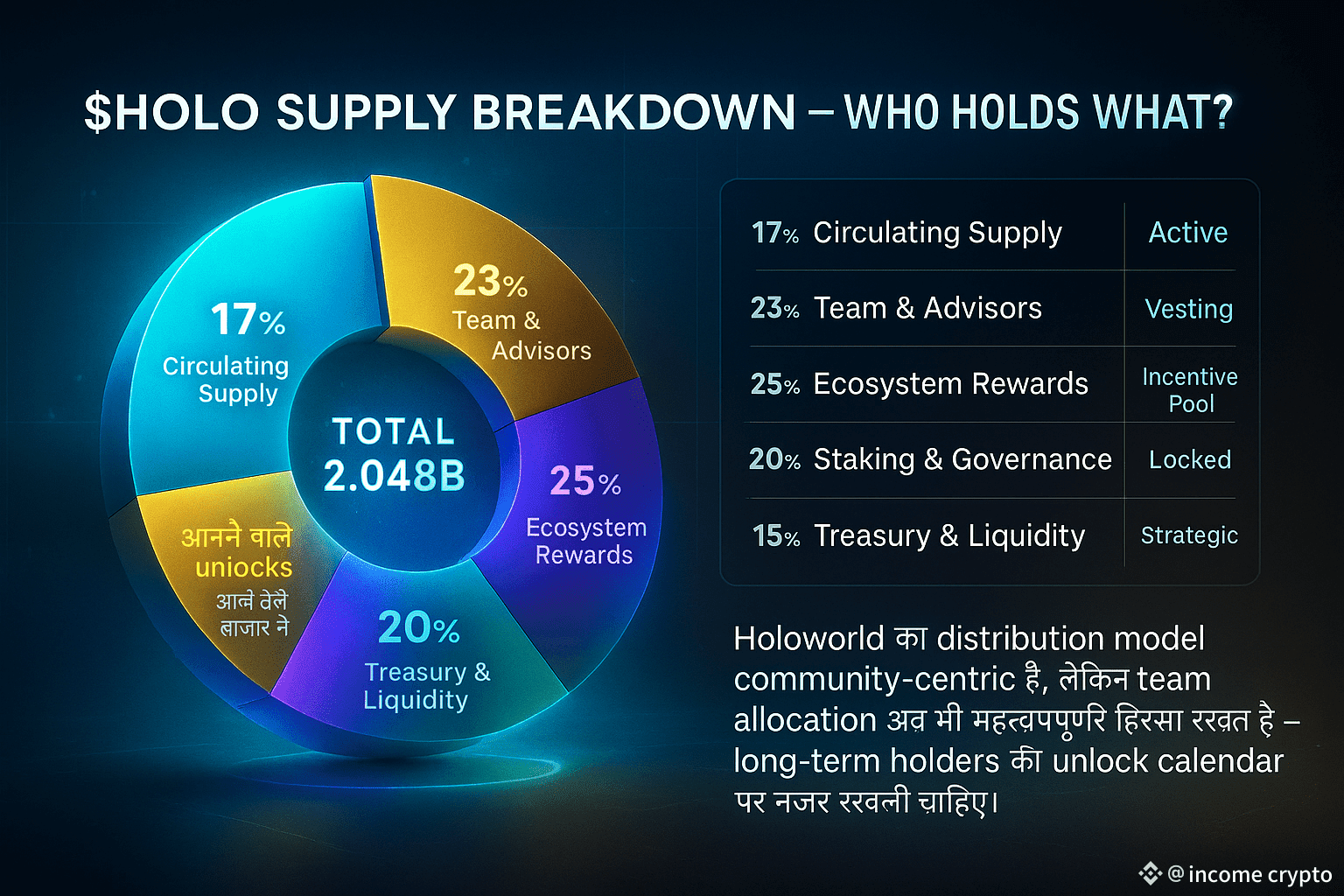 Holoworld एक ऐसा विचार प्रस्तुत करता है जो “AI एजेंट्स को Web3 में कार्य दिलाने” की दिशा में पहला गंभीर प्रयास है। पर यह विचार तभी सफल होगा जब पारदर्शिता, गवर्नेंस और उपयोगकर्ता सहभागिता समान रूप से बढ़े। यदि सब कुछ रोडमैप के अनुसार चलता है, तो Holoworld अगले एक वर्ष में अपनी मार्केट कैप को 5 से 8 गुना तक बढ़ा सकता है। पर शुरुआती निवेशकों के लिए एक ही सलाह पर्याप्त है: