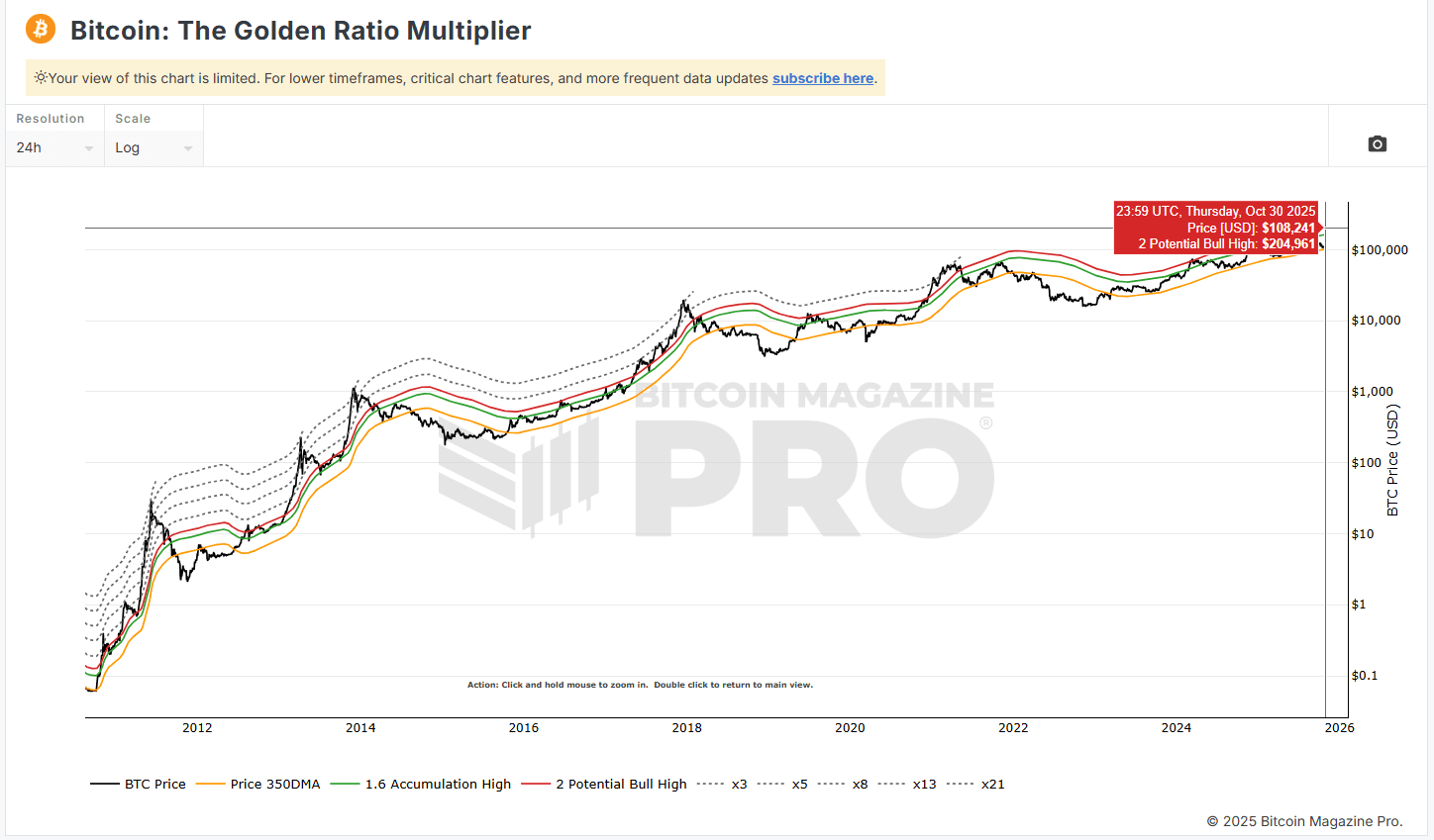 Ce que c'est : C'est une moyenne mobile simple sur 350 jours. Dans l'histoire du Bitcoin, cette moyenne mobile à long terme a agi comme un niveau de support fondamental pendant les marchés haussiers. Les prix peuvent tomber à ou légèrement en dessous, mais des ruptures soutenues en dessous ont souvent signalé la fin d'un cycle haussier et le début d'un marché baissier.