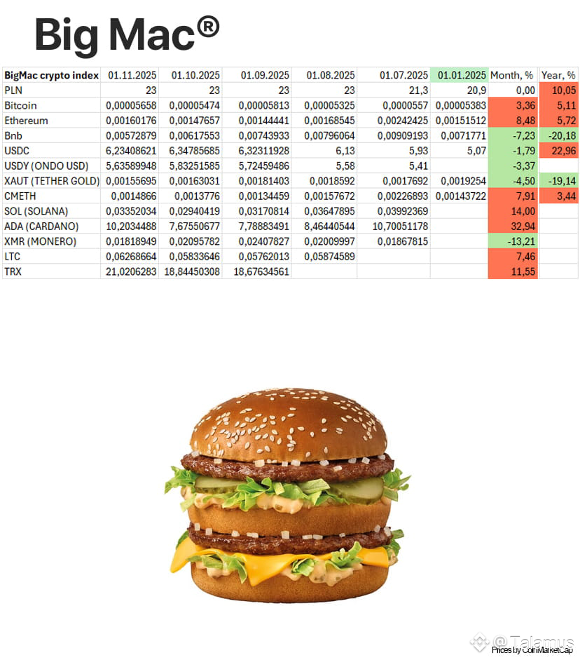 Осенний Big Mac Crypto Index показывает, что в 2025 году криптовалюты продолжают вести себя разнонаправленно.