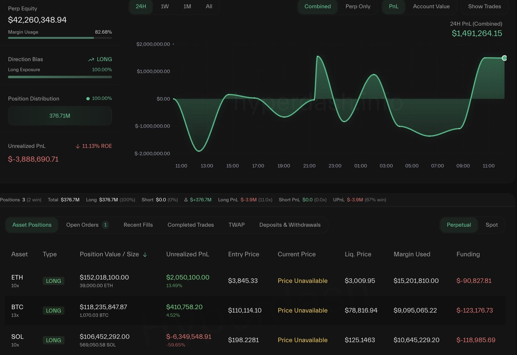 Cette baleine a actuellement environ 376,7 millions de dollars en positions actives. Pour mettre cela en perspective, c'est plus que ce que la plupart des gens gagneront en plusieurs vies, tout activement déployé dans trois actifs cryptographiques.